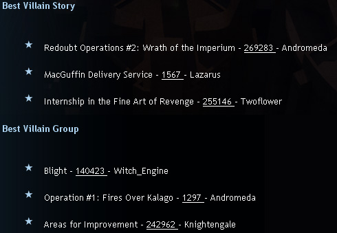Last week I had the pleasure to learn that Redoubt Operations #1: Fires over Kalago and Redoubt Operations #2: Wrath of the Imperium had been nominated in the 2009 Mission Architect Awards for Best Villain Group and Best Villain Story, respectively. (I’m not quite sure why Redoubt Operations #1 got misspelled, though.) In any case this news was the highlight of my week last week. Unfortunately, complete victory was not to be as “Internship in the Fine Art of Revenge” won Best Villain Story and “Blight” won for Best Villain Group, but still even being nominated among the thousands of other entries is incredible. Now, here’s to hoping my two arcs can manage to get a Dev’s Choice out of all this. Cross your fingers.